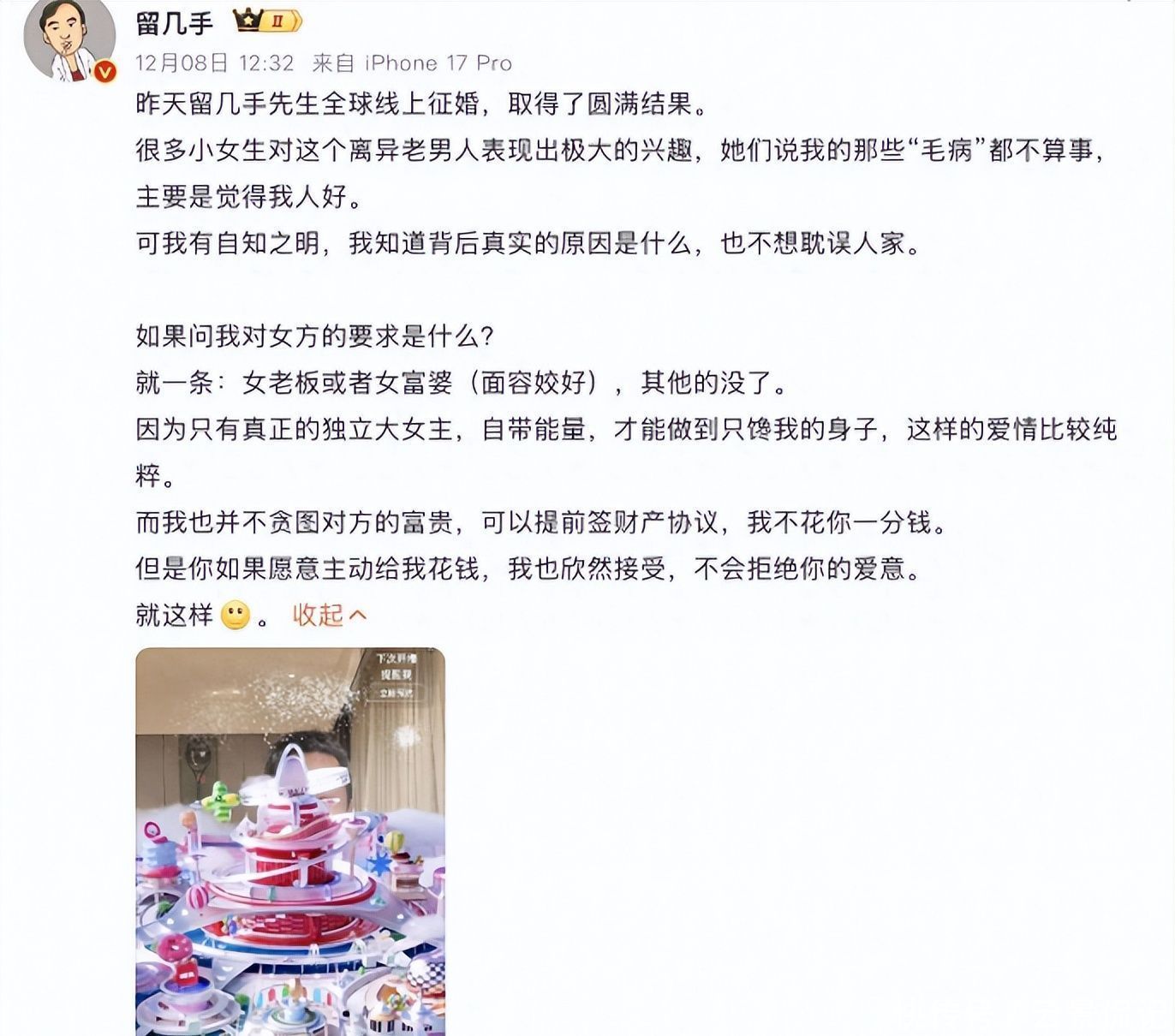 他还曾高调发布全球征婚启事,明示择偶标准为“资产雄厚女性”,