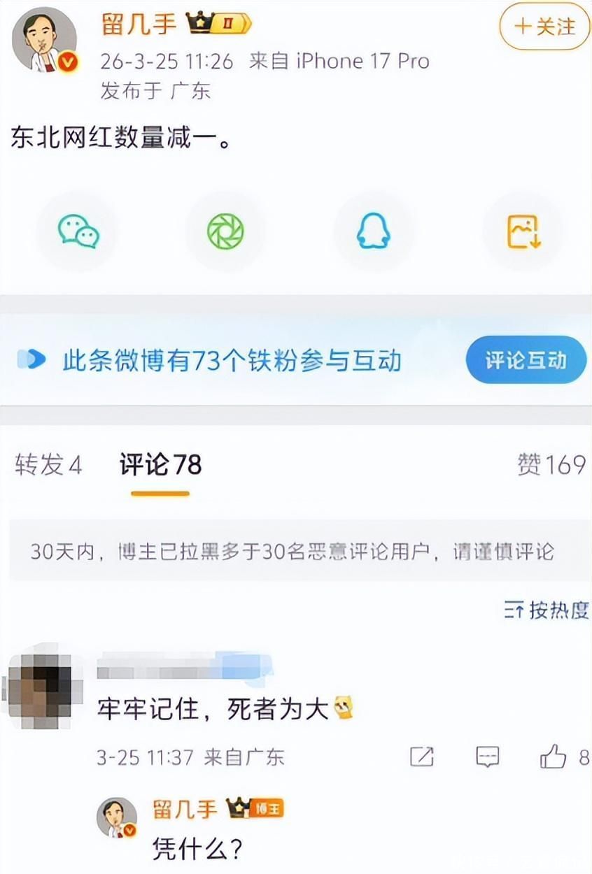 他在某平台更新状态称:“东北区网红名单再减一人”,